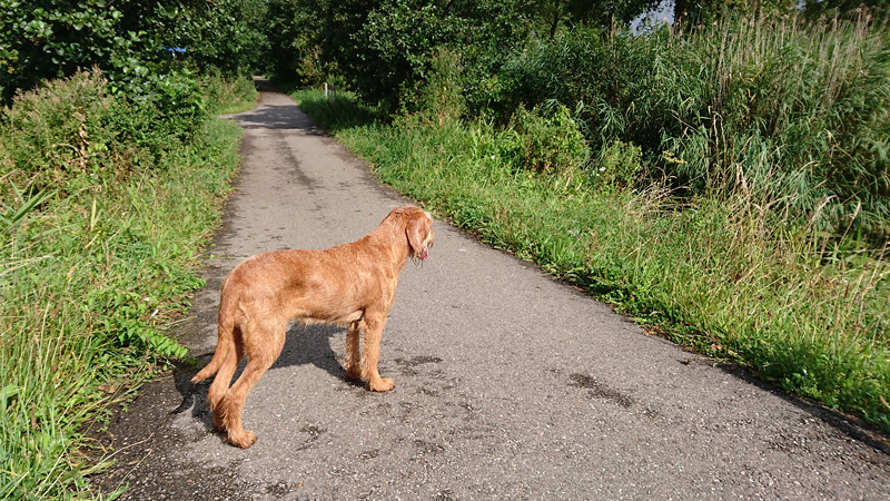 Het zonnetje blijft aanwezig en ik besluit woefje dan maar te laten zwemmen om wat af te koelen want ze doet vreselijk zielig alsof ze het erg warm heeft. Ze kijkt wel heel blij en loopt lekker mee. Maar als ik dan eindelijk bij het watertje aankom, is het toch ineens weer grijs en bewolkt. Bovendien kan ik ook geen stokje vinden om weg te gooien voor woef, dus ik besluit nog eenmaal de lange arm te lopen en dan terug te gaan. Zo warm is het niet meer met de bewolking. We lopen dus nog een paar kilometer en gaan dan terug.