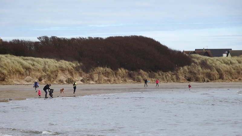 Fijn, maar er is geen strand en dus moeten we over de stenen strompelen op weg naar het pad over de golfbaan bij Seahouses. Vanaf daar loopt het weer lekker en zijn we alweer snel in Seahouses. Vanaf daar het strand op. Strand? Strookje bedoel ik. Strookje zacht paardenpad. Precies zoals voorspeld natuurlijk: hoog water. Als je het strand hier niet kent, dan weet je dus niet dat je hier normaal een prachtig breed strand hebt met hard zand. Nu dus even niet. Baal. Soms moest je even wachten om langs het water te kunnen als de golven even terug trokken. Waardeloos. Hier baalde ik dus een beetje. Ik was niet moe maar ik snap dit dus niet. Volgende week is het strand tot 19 uur begaanbaar, nu vanaf 13 uur al minder. Monkshouse was ook al ondergelopen maar ik was toch al nat dus vooruit maar. Daarna over de rotsen waar je iedereen zag klauteren en rommelen. Hier zouden we dus straks weer overheen moeten.
