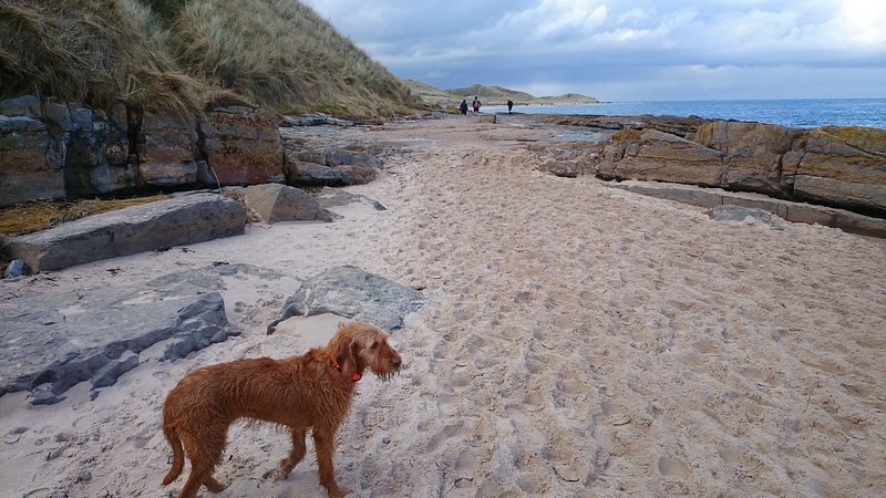 Stom genoeg liep de route langs een plas in de diepte en niet bovenlangs richting het kasteel of onderlangs over het pad. Hier dus modder happen en beetje glibberen maar dat ligt aan mij, want ik zag iemand er vlot overheen rennen zonder op of om te kijken. Wie weet kan ik dat ook nog wel eens. Nu even niet. Om het kasteel heen en richting de golfbaan. Daar was iemand een beetje RWR aan het doen en ik vroeg of hij RWR deed maar hij was ‘gewoon’ kapot en zou uitstappen (er zouden maar liefst 11 mensen uitstappen op de ultra afstand). Daar op de golfbaan zat mijn uitdunde crew in het zonnetje te wachten. Ik dronk wat en zei dat ik enorm nodig naar de plee moest en dat in Low Newton wilde doen (ik wist dat daar een openbaar toilet was). Verder en verder liep ik dus maar weer, wederom op bekend terrein want woef en ik liepen dit eerder en zelfs vorige week nog voor de laatste modder beoordeling. Golfbaan, door de duinen langs de vogelhut en richting Low Newton. Daar stond A. bij de toiletten klaar om de hond even aan te pakken (en de deur op een kier te houden omdat het licht het niet deed). Even snel plassen, weer goed aankleden en maar weer op weg richting High Newton waar CP 2 was. Daar stond water voor woefje maar net toen ze een slokje wilde nemen deed een andere hond lelijk en wilde ze niet meer. Zielig maar goed, we moesten dan maar weer door. Woeffie vond het enig, zeker met al die mensen die wat tegen haar zeiden. Ze hijgde, kwispelde en keek blij. En de riem maar slingeren tegen mijn benen. Misschien toch een beetje te lang. Maar op deze manier kon ik haar snel pakken als het moest. Dus jammer dan. Al snel kwamen we bij de lange brug richting Beadnell. Hier rechtsaf het strand op en…. oei oei oei wat klote. Heel zacht zand echt net een ruiterpad. Dat wist ik wel maar nu leek het een uur te duren voordat ik op normaal strand terecht kwam. Balen en wat zwaar. Maar toch…. ik wist hoe lang, hoe en wat dus gewoon maar even door. Aan het einde weer mijn trouwe crew en daar een bakje water voor woef en een Complannetje voor mij om te eten (leerpuntje: te laat op 33 km). Pffff ik vond het daar wel zwaar maar verder gingen we weer. Door Beadnell en weer rechtsaf het strand op. Dat strand was alweer een stuk kleiner en het is een strand met grote ronde stenen. Dat liep niet fijn en ik vreesde voor het einde van het strand: de waterarm bij de golfbaan. Nou inderdaad.