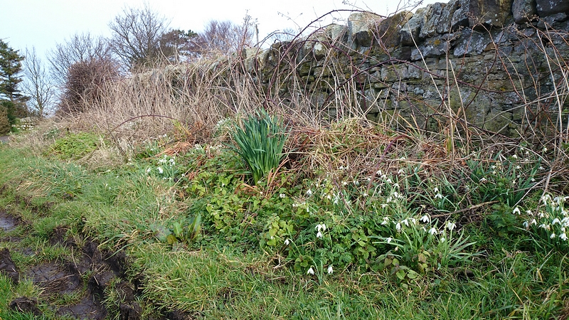 Ook gesneden koek en het liep lekker. Weinig wind, zonnetje en prima grasland. Al snel kwam ik in Boulmer aan en ging verder over weiland met de schaapjes. Ook prima te doen en ik vond dat het al aardig opschoot. Vanaf daar naar een strandje en over een modderweg langs de enge koeien. Verdomd zeg, die koeien stonden er gewoon nog maar ze stonden links en ik had er nu – met als toen ik het parcours verkende op de heenweg – geen last van. Toch raar dat die beesten er dus gewoon nog stonden. Maar niks aan de hand en ik hobbelde verder. Stukje naar beneden naar een strandje en weer langs het water. Ik was benieuwd hoe dat stukje nu erbij lag want dat had ik van de week nog een keer gelopen. Door en door ging het…. beetje modder maar wel redelijk te doen. Bij de inham bij Howick stond mijn trouwe support crew weer. De volgende halte zou Craster worden op 25 km en daar zou ik woeffie krijgen. Ik hobbelde dus verder en was eigenlijk verrast dat ik er al heel wat kilometertjes op had zitten. Ik genoot van het uitzicht op de zee vanaf de klif en de gele bloemetjes aan de struiken die aan het uitkomen zijn. Mooi gezicht, ik vond het vorige week al erg mooi toen ik hier liep. Ik naderde Craster.