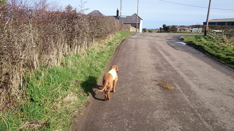 Het pad voor de huizen langs was OK net zoals vorige week. Wat een verschil met de eerste keer dat ik er liep en het niet te doen was. Door Craster village en daar stond mijn driekoppige crew die zou worden uitgedund tot twee met een mobiele eenheid. De mobiele eenheid vond het meteen helemaal leuk en vanaf dat moment liep ik dus met een slingerende riem om mijn middel. Woef liep lekker los, dat leek me ook beter met het oog op andere wandelaars en renners. De HM startte immers in Craster en de marathonners kwamen inmiddels ook voorbij. Over het weiland naar Dunstanburgh Castle. Gesneden koek voor woef en mij. Natuurlijk ging woef meteen eens lekker zitten voor een grote boodschap en kon ik dat ook nog eerst oppakken en in een zakje gaan doen. Ik deed dat maar weer in de rugzak zoals ik eerder deed. En weer op weg dan maar. Wat was het leuk zo samen op pad. Samen weer op weg richting Dunstanburgh Castle. Voor mijn gevoel al zo dichtbij huis. Dat is helemaal niet zo, want we hadden er pas 25 km opzitten en dat was dus niet eens op de helft. Maar zo voelde het niet. Ik heb geen moment gedacht ‘jee wat ver nog’.