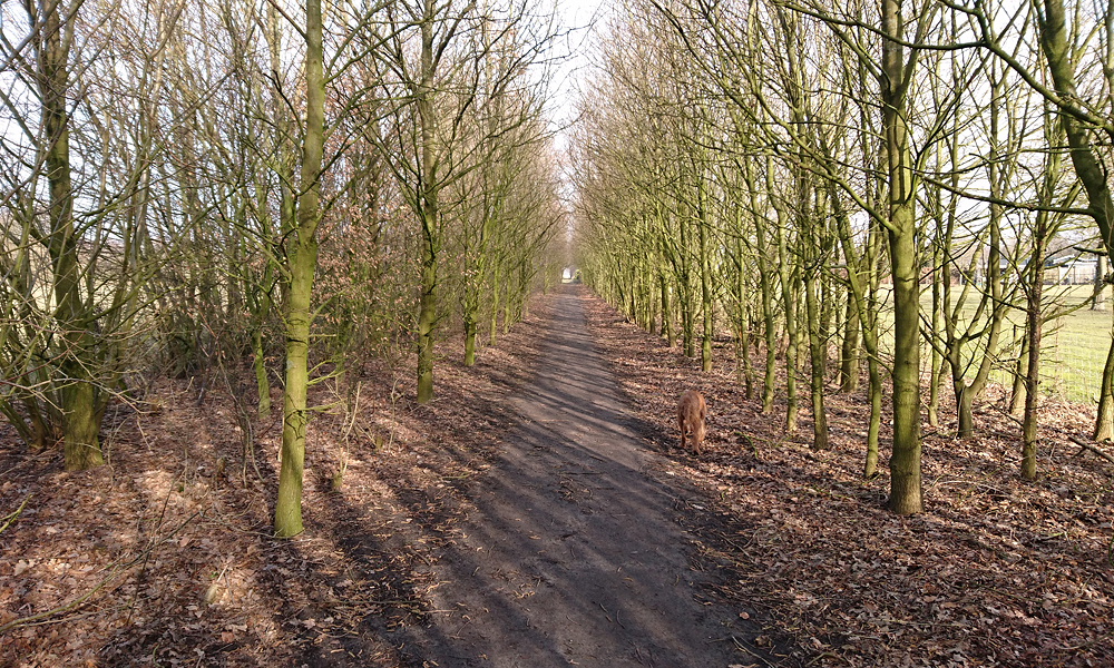Gisteren hebben we niet meer veel gedaan vanwege het rare weer maar vandaag gaan we echt even wat dingen afmaken zoals de Hedera schermen in de tuin. Ik ga dus meteen met woefje op pad maar kies voor een heel kort rondje. Even naar de Steigerberg en daarna parallel aan het fietspad naar de begraafplaats. Daar maak ik een lusje door het bos en loop via het fietspad weer terug. Snel en kort en na een kleine 6 km staan we weer voor de deur.
