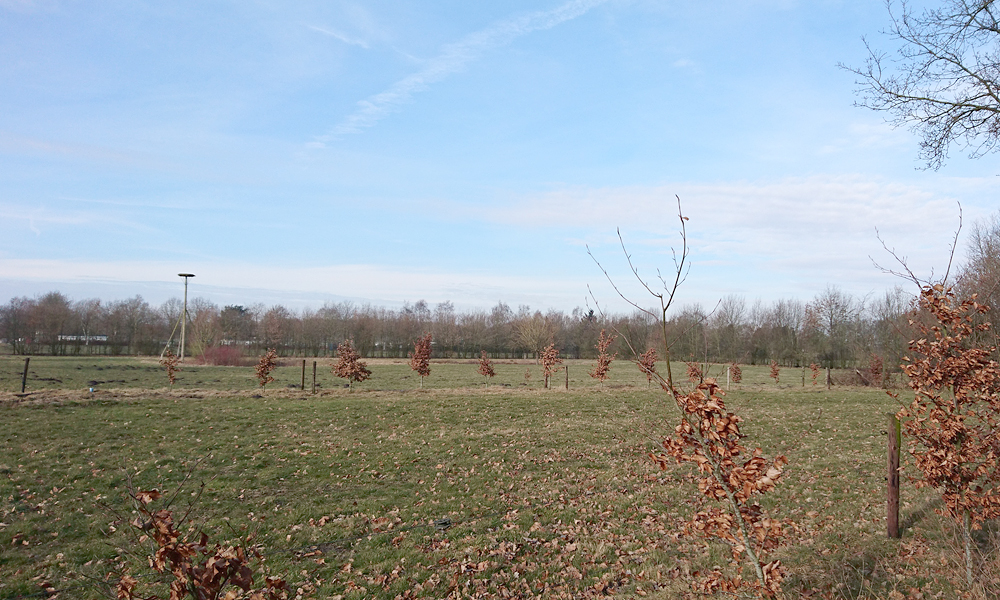Aan het einde van het pad steek ik de snelweg over en loop naar de zandverstuiving. Woefje is hier weer netjes even aan de riem. Ik maak een kiekje en loop daarna langs het hek weer naar de Klarenweg. Helemaal aan het einde kom ik een dappere dame op en mountainbike tegen. Ik ga door de hekken, steek snelweg en spoor over en hobbel verder. Even over het stukje ‘eigen weg’ van iemand en daarna tussen de weilanden door. Er staan volop sneeuwklokjes.