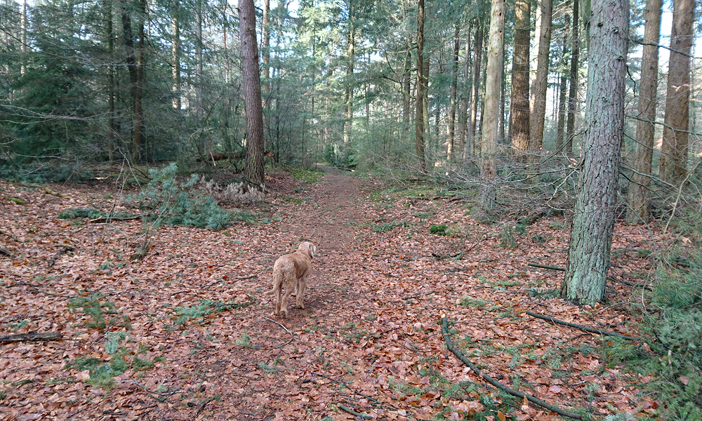Ik slinger verder gewoon een beetje dullig door het gebied en probeer te onthouden welke paden ik al heb gehad en welke richting ik eigenlijk op loop. Ik zal dat mos toch ooit wel eens echt leren kennen hoop ik? Tussendoor jog ik alsnog enkele stukjes maar het zand is zacht en overal liggen blaadjes over de wortels. Woef is in ieder geval helemaal blij en ik dus ook.