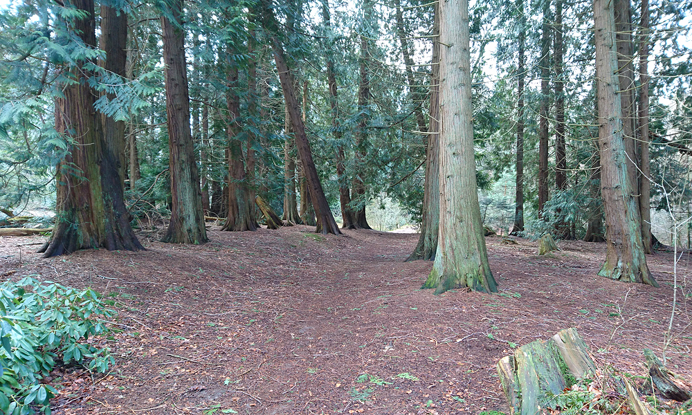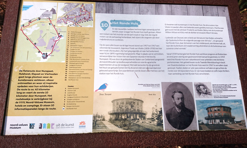 Daarna neem ik een breed pad en ga proberen om over een nieuw pad terug naar de Elspeterweg te komen. Ik wil namelijk niet over de weg lopen waar ook af en toe een auto kan rijden. Het is mooi maar ik moet wel af en toe op de kaart kijken en het loopt ook niet overal even makkelijk. Verderop komen we ineens bij een informatie bord van het Ronde Huis. Bijzonder toch dat in Nederland nooit een ruine wordt onderhouden van zoiets maar alles gewoon wordt gesloopt. Heel jammer want er is niets meer van over (behalve de rododrendons en de vennetjes). De bomen rond het oude Ronde Huis zijn gigantisch groot. Eindelijk een echt stuk bos. Hoop dat ze dit niet ineens ook gaan kappen.