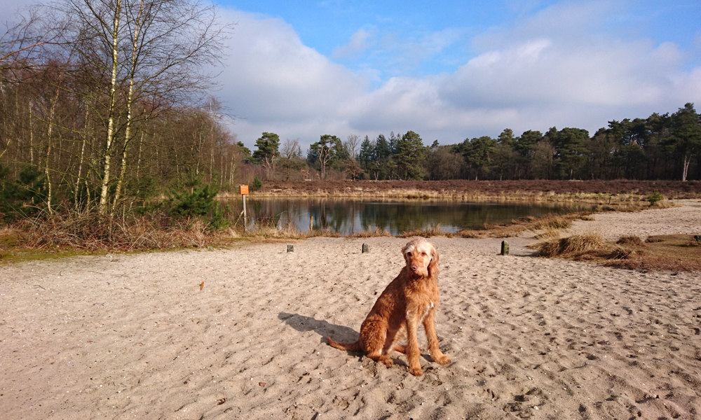 Ik heb wel zin om een flink stuk te lopen dus ik ga even door het bos richting de kwekerij en loop daarna een stuk over de weg. Woefje moet daarbij een klein deel aan de riem maar dat lijkt ze niet erg te vinden. Ik doe dat alleen omdat ze me niet hoort en ik haar dus niet meer kan corrigeren met geluiden. Lastig maar dan maar zo aan de riem. Om het voor haar ook leuk te maken, sla ik weer rechtsaf naar het Veluwemeer. Dat blijft een prachtig plekje en woef kan daar even drinken. De vorige keer had ze na haar badderpartij ijspegeltjes aan haar buik. Nu is het gelukkig een stuk warmer.