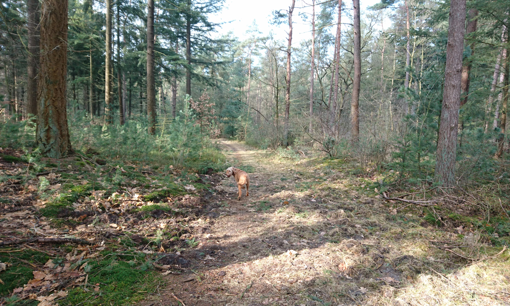 Als we weer bij het bos aan de overkant komen, besluit ik het rondje over het landgoed nog even eraan vast te knopen vanwege het mooie weer. Gek genoeg loopt dat tegen de klok in dus absoluut rottig. Geen idee hoe dat komt maar ik zwik aan alle kanten over het smalle paadje en dat gebeurt niet als ik de andere richting op loop. Voortaan dus maar de andere kant op dan.