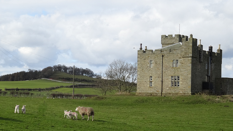 Het is me wel bevallen die nieuwe avonturen dus vandaag ga ik weer naar een onbekend stukje. Gisteren was ik bij verrast met het forest rond Chillingham en op de terugweg liep ik langs Hepburn waar je kon parkeren en waar je ook een stukje door een bos zou kunnen. Bovendien had ik gezien dat er in het bos een oud fort te zien zou zijn (nou ja, rotsblokken dan) en even verderop nabij Lilburn nog een standing stone met een folly tower. Genoeg te zien en te beleven dus en in de ochtend tuur ik op de kaart en maak ik samen met S via de telefoon een aardige route van 13 km Eerst via het bos, daarna onderlangs over een rustige weg richting Lilburn, langs de toren en de standing stone en dan weer terug naar de parkeerplaats bij het bos. Eitje toch? De route staat al snel in mijn navigatie en niet veel later gaan waf en ik op pad. Het is geen heel helder weer, maar ik ben blij met de temperatuur. Er staat geen wind, het is droog en niet te warm voor woefje. De parkeerplaats is natuurlijk snel gevonden aangezien ik daar gisteren in mijn uppie langs rende op de terugweg naar de auto. Ik tuur even op het bord en maak ook een foto van het Bastle House aan de overkant van de weg. Ik ga straks wel verder kijken want ik kom er straks weer langs op de terugweg.