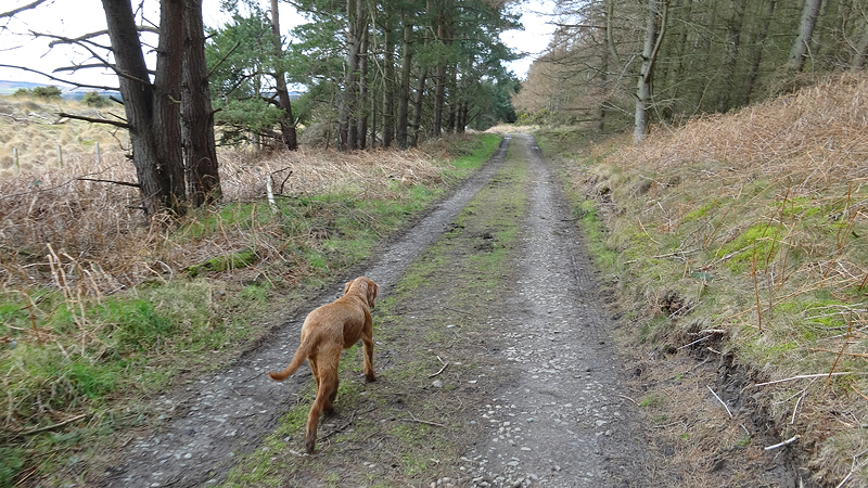 Ineens stuiten we op een hek met een opening waar we normaal doorheen kunnen. We hobbelen door het heide pad maar ik twijfel en kijk op de kaart. Nope. Verkeerd. Ik ga weer terug naar het hekje en kijk nog eens goed. Zijn die zwarte lijnen op de kaart nou hekken dan? Dan zou ik dus aan de andere kant van het hek moeten blijven lopen om straks buiten het bos te lopen en aan de zuidkant weer op de weg uit te komen straks. Ik kijk en kijk nog eens. Ik dwaal een beetje rond maar ik zie met de beste wil van de wereld geen pad. OK. Mijn getekende route wordt het dus niet. Geeft niet, ware het niet dat op de kaart het pad dat ik wel kan volgen straks dood loopt. En dan? Vreemd maar ik besluit het pad toch te nemen. Ik vermoed dat ik met een beetje geluk straks gewoon op dat brede pad ga uitkomen dat me weer naar de auto zal leiden. Vanaf daar kan ik dan wel weer een route maken richting die tower en die standing stone die ik graag wil zien. Gewoon de ene voet voor de andere zetten en zien waar je uitkomt!