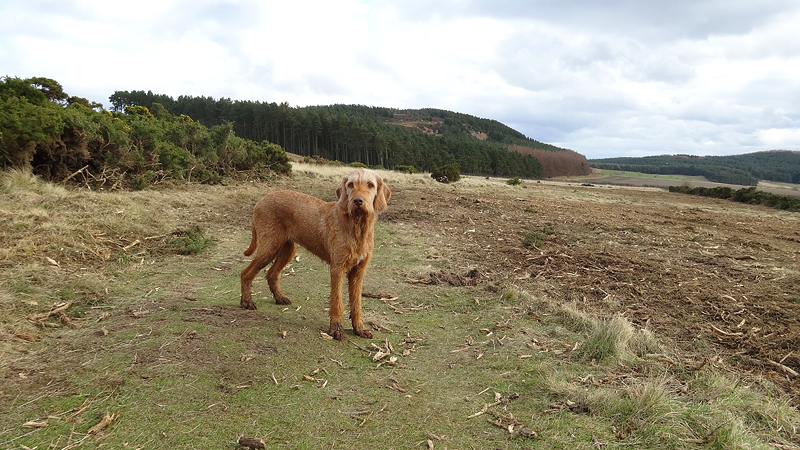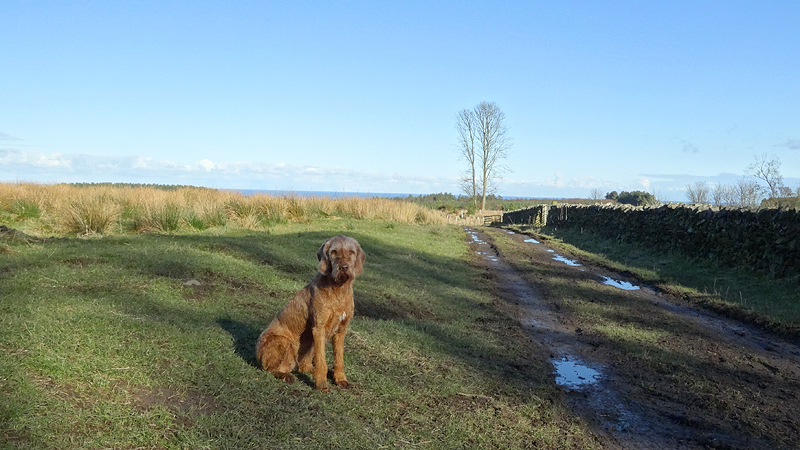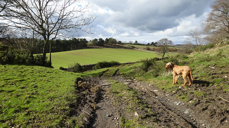 Ik klauter omhoog en woef doet ook haar best en loopt voor me uit. Al snel komen we bij een stile waar ik overheen kan en zij gelukkig makkelijk onderdoor kan kruipen.