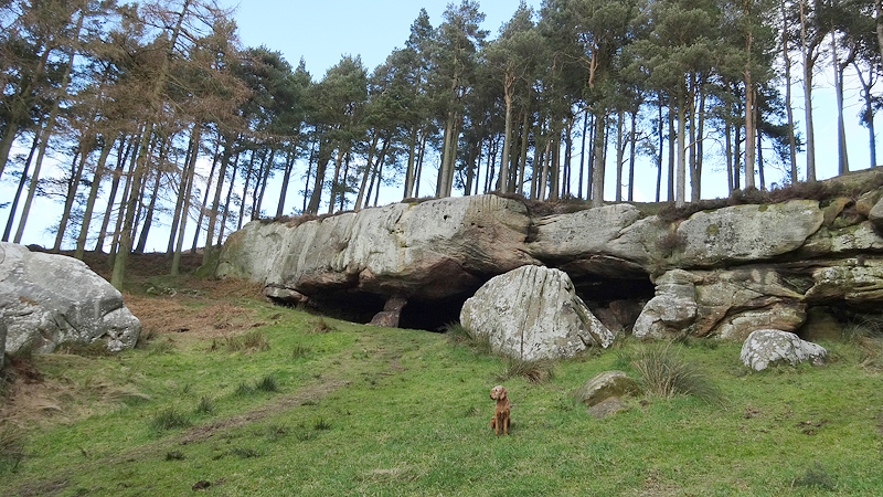Als ik even rond gekeken heb en wat foto’s gemaakt heb, ga ik weer terug over het hek en samen met woeffie lopen we weer naar de weg. Ik maak nog een foto van de standing stone en woef rust ondertussen even uit en heeft een takje gevonden om mee te spelen.
