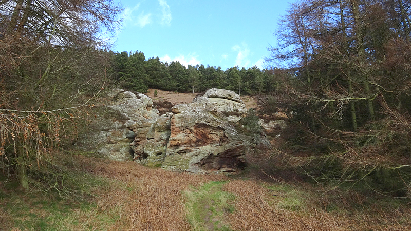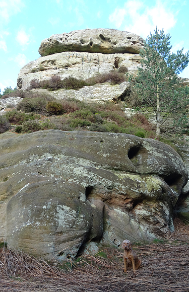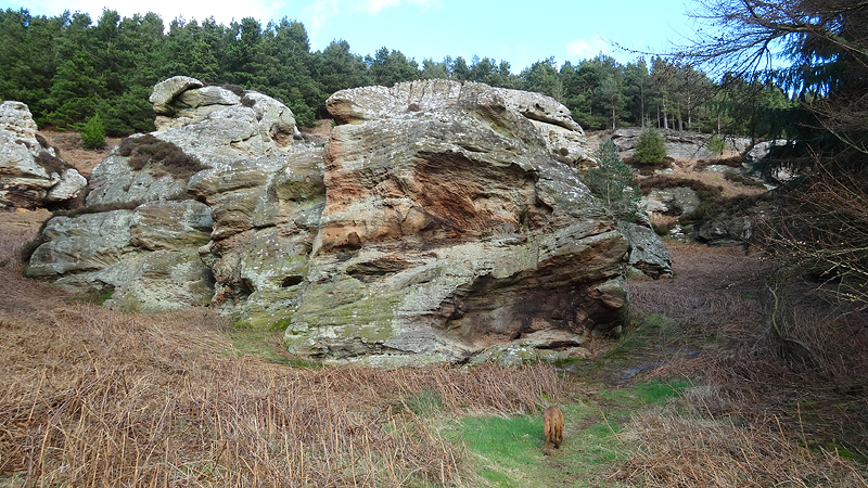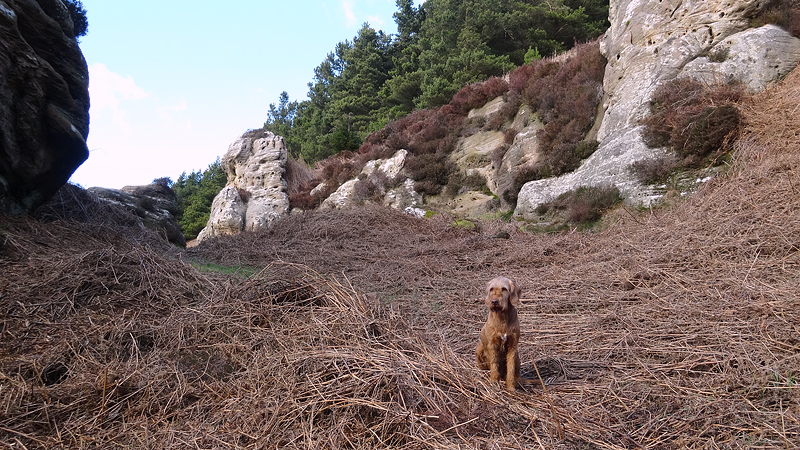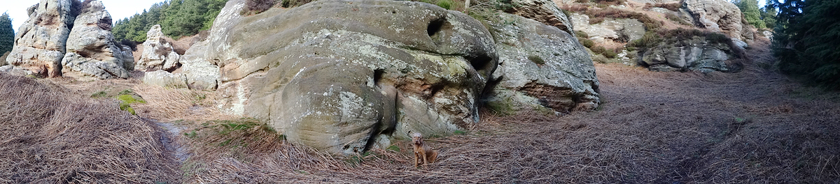 De weg loopt akelig steil naar boven maar er zijn genoeg planten en boompjes waar je je aan vast kunt houden. Van rennen is hier geen sprake, ik klauter echt naar boven. Gelukkig is het niet erg open dus niet eng maar ik baal er wel van dat woef haar harnas niet aan heeft. Wist ik veel…. Ik zie vanaf een afstandje al de enorme rotsblokken van het oude fort. Op de foto zie je rechts op een van de blokken een figuurtje staan. Dat geeft wel aan hoe groot die dingen zijn. Maar ik ben er nog niet en we klauteren rustig door. Het lijkt een beetje op Simonside maar het is een langere en steilere klim.
