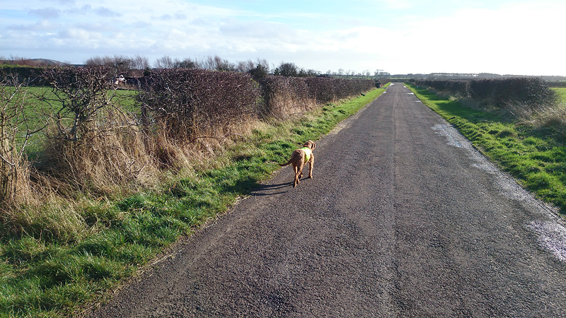 Na dit eerste stukje woef thuis opgehaald, gauw dekje omgedaan en weer op pad over de weg. Ik wist niet goed wat ik wilde lopen, dus ik besloot maar eens het weg rondje om de cottage heen te doen als een soort tempo run. Dat heb ik heel lang niet gedaan. Uberhaupt dat rondje niet, want vorig jaar liep ik er geen enkele keer. Het viel me erg tegen, want het stuk richting het kasteel loopt erg op en neer en elke keer als ik de afslag naar rechts verwachtte, kwam er weer een klimmetje. Bovendien lagen er volop plassen. Geen plasjes, maar gewoon over de hele breedte en heel diep. De eerste omzeilde ik nog via de berm (dat kost dus heel veel tijd) en uiteindelijk denderde ik maar door alle andere plassen heen. Ik train dit soort dingen nauwelijks op dit moment maar ik denk dat ik het toch ga invoeren weer voor de laatste weken. Elke week een keer dat rondje, en daarna eventueel weer verder of iets dergelijks. Maar ik was niet ontevreden over hoe het ging. Wel over de MM maar niet eens ontevreden over de tempo run daarna. Woef vond het allemaal machtig mooi. Inmiddels is ze loops geworden dus over een dag of 10 kan ik wel gaan lopen met een grote stok. Het enige risico is de boerderij hond hier. Die staat normaal al voor de ramen te turen en straks natuurlijk helemaal. En als woef zelf dan ook wel ‘zin heeft’….. Dat gaat nog lastig worden.
