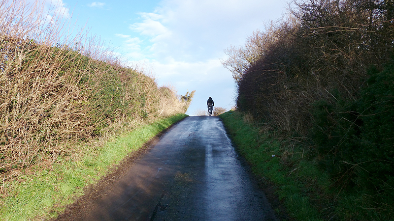 Verder en verder gingen we. Elford, helemaal richting de A1 waar we normaal met de auto rijden. Op en neer maar gestaag verder. Aan het einde rechtsaf richting Lucker. Niet echt een fraaie route, maar met dit mooie weer wel OK. Eindelijk een beetje zijwind en dat voelde een stuk lekkerder, maar ook een stuk warmer. Zo is er altijd wel wat te zaniken natuurlijk. Ik probeer een stukje Twix. Ik kauw… en kauw nog meer…. en kauw… Ik krijg het echt niet weg en uiteindelijk spuug ik het maar uit. Ik kan er niks mee en durf het niet door te slikken. Dan maar niet. Dat is dus geen succes. Dan maar wat water en mijn eerste slokjes gel uit mijn softflask. Ik schreef het al eerder: echt een uitkomst omdat je gewoon eruit kunt drinken zonder gedoe met papiertjes etc.