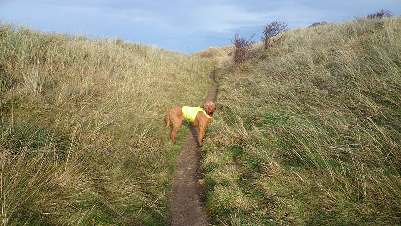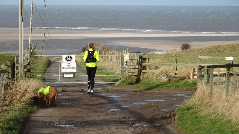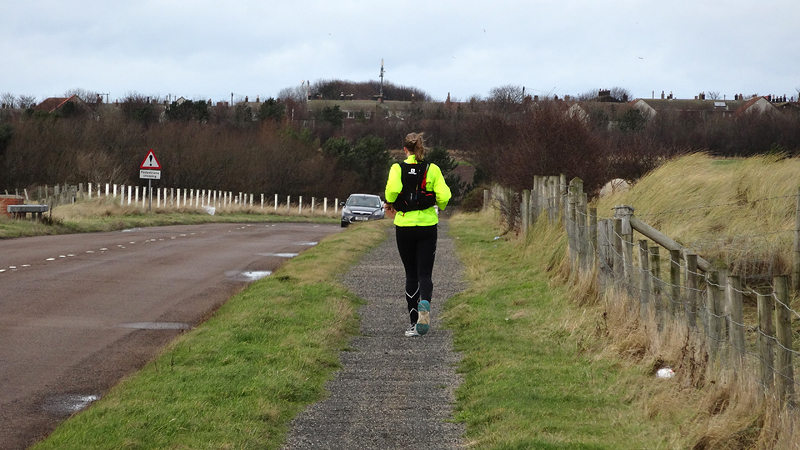 Verder en verder lopen we. Terug richting Seahouses eigenlijk, maar met een soort achtje door richting Beadnell. Eigenlijk schiet het best op al. Ik krijg wel honger en neem nog een chocomelletje. Mijn reserve choco die S in zijn tas had. De rest heb ik allemaal in mijn eigen rugzak als test. Water, gel, chocomel etc. Maar op ‘niks’ is dus we erg niks dus daar moet ik nog even goed over nadenken.
