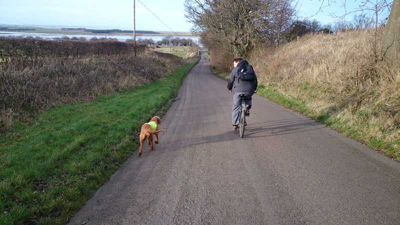 Helaas moeten we een stuk over een tamelijk drukke weg en daar zet ik toch maar even de turbo aan om er zo snel mogelijk weg te zijn. Zo zie je… een versnelling kan je altijd we inbouwen zonder dat te plannen. Als ik over een pad van beadnell naar seahouses loop, heb ik ineens de wind in de rug en besluit ik even aan te zetten nog. Dat gaat prima en het loopt heerlijk! Van Beadnell komen we weer in Seahouses. Ai… even een mentale dreun want nu ben ik er bijna. Maar niet echt, want ik moet nog een kleine 12 km met de hond straks! S. fietst vooruit om de hond klaar te maken voor vertrek en om toch nog even een softflask te vullen met sportdrank om eens te proberen.