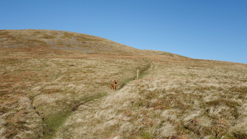 Hoewel ik uiteindelijk tegen de muur aan een echtpaar zie zitten met en hondje. Even uitblazen uit de wind. Het is maar goed dat de hondjes even spelen, want ik zie ineens dat op het hek waar zij tegenaan zitten een bordje staat met de route die ik wil volgen. Overigens zie ik later dat het geen probleem was geweest als ik toch rechtdoor was gelopen maar toch…. We kletsen even wat over de route en over de honden en daarna ga ik weer op pad. Ik begrijp nu waarom ze het ineens over modder en vachten hadden, want dit deel van de route is ineens nat en modderig terwijl het hele eerste stuk alles kurkdroog was. Misschien nog door de sneeuw die inmiddels gesmolten is. Dat geeft altijd erg veel water. Bovendien schat ik in dat ik vorige week parallel wat meer zuidelijk aan het lopen was bij Broadstruther in die ijs rommel. Misschien komt het door de stroompjes dat het toen ook zo heftig en onbegaanbaar was! Het is dus maar goed dat ik toen voor de terugweg over de weg koos en niet over de St Cuthberts way zoals nu. Weer wat geleerd.