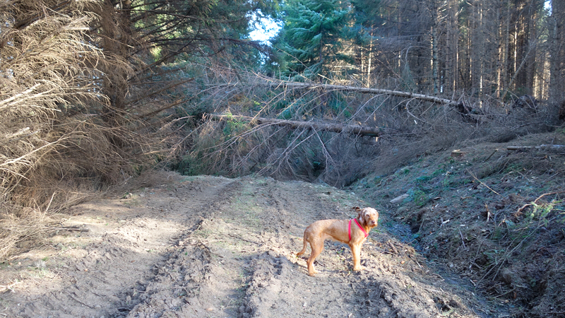Lekker lopen zo…. Inmiddels zijn mijn schoenen zwart van de modder en ziet woef er niet uit. Ik schreef al dat ik vooral de pest in had vanwege haar verband. Mijn kleding en schoenen kan ik zo afwassen en ik krijg niks van modder en rommel maar ik koos voor dit pad en stel woef nu bloot aan iets dat misschien niet goed voor haar is. Ik moet toch even door, en hoop dat het straks beter wordt. In mijn rugzak zitten nieuwe rolletjes zodat ik haar eventueel een nieuwe bandage kan geven als we uit de rommel zijn. We ploeteren dus maar even door. Het is maar goed dat het zonnetje schijnt en ik laat mijn rechter hersenhelft harder roepen dan links die weer aan het muiten is en roept dat er niks aan is. Doorgaan!