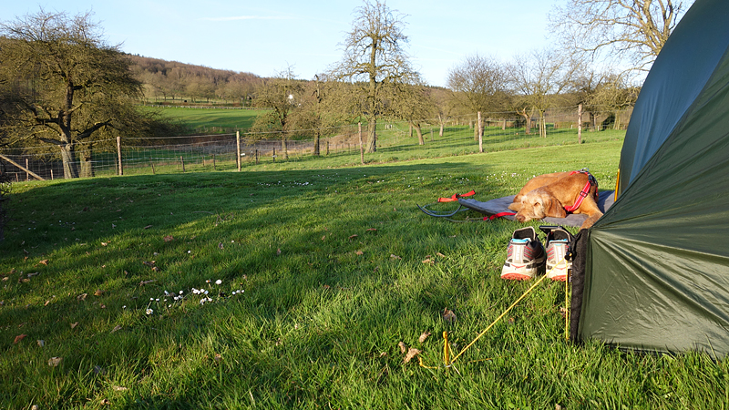 Omdat het mooi weer zou worden en ik morgen in Aken moet zijn, besloot ik om te gaan lopen in Limburg en te overnachten op een boerderijcamping. Iets heel kleins, geen kinderspeeltoestellen, mooi uitzicht en geen caravans voor je neus of zoiets. Ik had alles al geboekt ruim van te voren, de route was klaar dus ik kon op pad! Rond 12.30 kwam ik aan en na een uurtje had ik een mooie plek gevonden, de tent opgezet en ingeruimd en was ik op weg voor mijn run met woef. Ik had een tussenstop bij boscafe ‘het Hijgend Hert’ gepland om daar ook iets te eten. Weer op gang komen daarna zou wel even een probleem zijn maar het zou niet zo ver zijn richting de tent dus vooruit maar. Maar zo ver was het nog niet, ik moest eerst nog beginnen met de run!