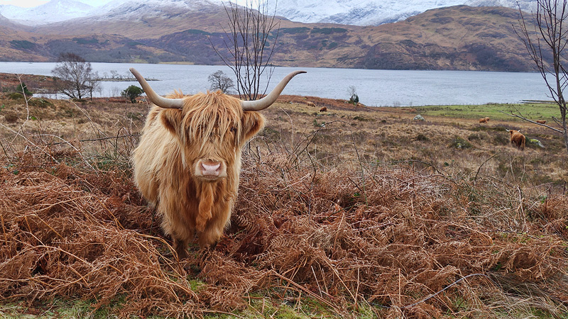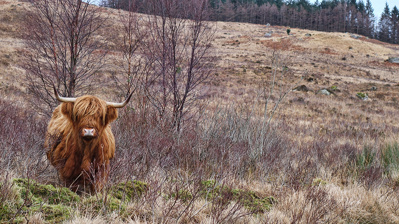 We maken even wat plaatjes bij het uitzichtspunt en gaan gauw weer verder. Het is nog steeds droog en de wind is matig dus we hebben wel geluk ondanks dat het niet helder geworden is tot nu toe. Ik heb het best warm gekregen van de klimmetjes en mijn warme kleding maar ik weet ook dat we straks weer over de open vlakte zullen lopen dus ik doe nog niets uit en wissel een beetje af met hoofdband op en af en handschoenen aan en uit. Al snel gaan we door het eerste hek en lopen we de open vlakte op waar de Hooglanders staan. Ze zijn er weer en inmiddels denkt woef dat het leuk is om tegen ze te blaffen wat niet de bedoeling is natuurlijk. We laten de drone nog een keer op maar de beelden zijn niet zo fraai helaas. De wind valt mee hier maar het is best fris en de wind trekt ook wat aan. Goede keuze om hier te blijven en niet naar de Glen.