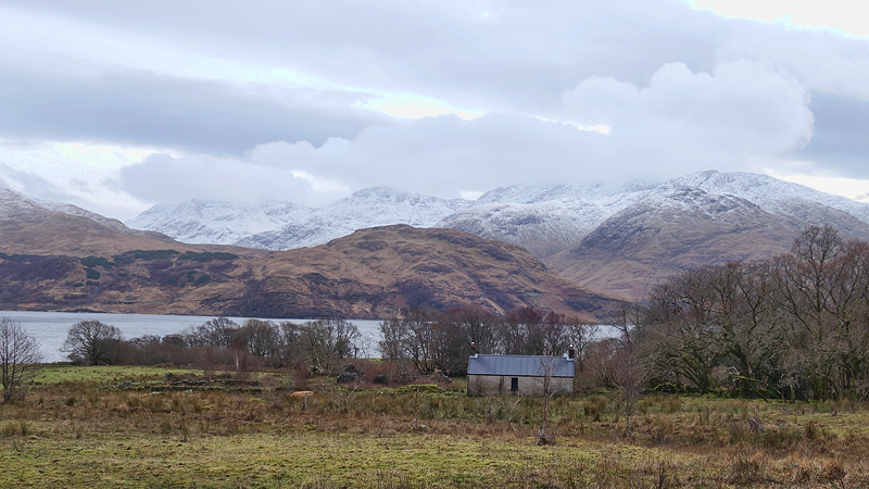 Vandaag zou het aardig weer worden, en daarom wilden we in Glen Etive gaan lopen. Eerst herten kijken en daarna een stuk over de weg lopen en fietsen. Niet zoals vorig jaar over een onbegaanbaar pad maar gewoon over de weg die erg mooi is tussen de bergen. Maar ik had ineens bedacht dat het met koud weer onder het vriespunt wel eens glad zou kunnen zijn op weg naar de Glen en ook door de Glen zelf en toen we de webcam bekeken die daar op de weg tussen Glencoe staat, besloten we dat het inderdaad geen goed idee zou zijn om die richting op te gaan (-4) en daarop besloten we nogmaals vanaf Bonawe richting het Glen Etiv path te lopen. Het weer werd uiteindelijk toch ook niet zo mooi als voorspeld en de 3 graden zou al koud genoeg zijn. Voor de zekerheid namen we de drone mee maar dat werd uiteindelijk niks. Het was donkerder dan gehoopt en de sneeuw op de bergen met de witte lucht als achtergrond gaf ook lelijke beelden. Maar al bij de quarry maken we wat beelden met de drone en worden we meteen ook ijskoud. Maar daarna gaan we snel op weg voor de run. Ik ben zo koud geworden dat ik aanvankelijk bij de warming up mijn jas zelfs aanhoud. Daaronder zit nog een wintershirt en mijn Falke primaloft jack.