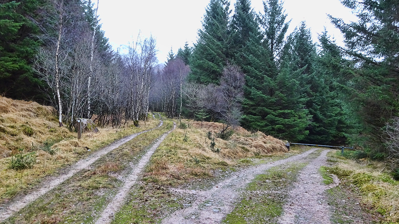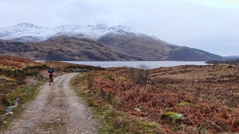 Bij de oversteek gaan we door het open hek terug over het veld en zijn al snel weer bij de hangbrug waar S. weer op de fiets stapt en ik weer ga lopen. We slaan nu eerst rechtsaf en nemen het pad richting Glen Etive path. Vorige keer zijn we een stukje die kant opgelopen totdat het ging sneeuwen en wel genoeg was. Nu hopen we wat verder te komen.