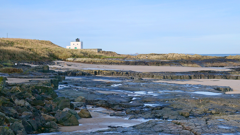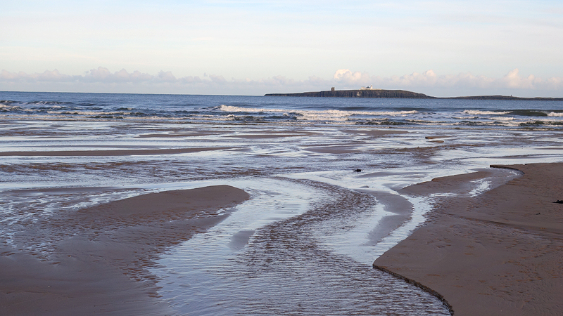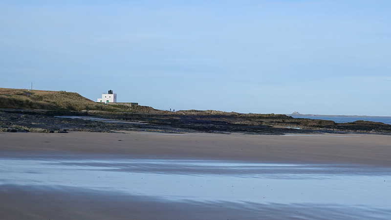De zon staat niet helemaal goed voor mooie foto’s maar ik maak toch een kiekje van het castle met woef en loop verder richting Stag Rock. Ook daar moet ik weer een watertje oversteken maar dat doet me niks. Gek idee dat ik me een paar jaar geleden nog liet tegenhouden door dit soort dingen maar toen droeg ik ook andere schoenen. Misschien maakt dat ook uit. Ik loop tot het eind van het strand en maak een paar foto’s van het vuurtorentje maar krijg het hertje er niet goed op. Het strand ligt heel laag en ik kan de rotsen niet makkelijk opklauteren. Althans, dat kan wel maar ik heb er eigenlijk geen zin in. Ik vind het zo heen en weer genoeg voor vandaag omdat ik anders veel te laat terug ben voor het eten van woef door het gedoe met de auto. Ik had eigenlijk wel plannen om aan de andere kant nog even te kijken maar dat komt een andere keer dan wel. Het is wel prachtig want ik zie zelfs Holy Island liggen met het castle daar. Als e op de grote foto kijkt dan zie je het nog net rechts naast de rotsen.
