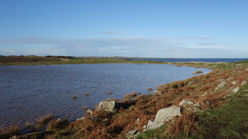 Al snel zijn we bij de rotsen die ik even op moet klauteren naar het pad langs de golfbaan. Woef kiest weer de beste weg en ik volg haar. Snel verder maar ik moet even alles bekijken met dit mooie heldere weer. Geweldig! Ineens zijn we een stuk hoger en zie ik het castle al vanaf de achterkant. Links van me bij de zee die rare stenen brug.