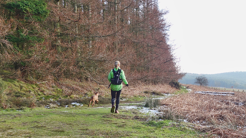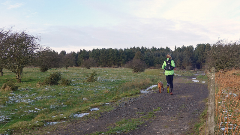 Al snel ben ik bij het punt waar ik op de St Cuthberts Way ook liep met woeffie. Ik denk terug aan de enorme hitte die dagen en aan het watertje dat nu bevroren is aan mijn rechterkant. Daar liet ik woef destijds even afkoelen. Nu lopen we lekker door op weg naar het stukje bos even verderop.
