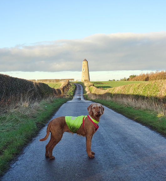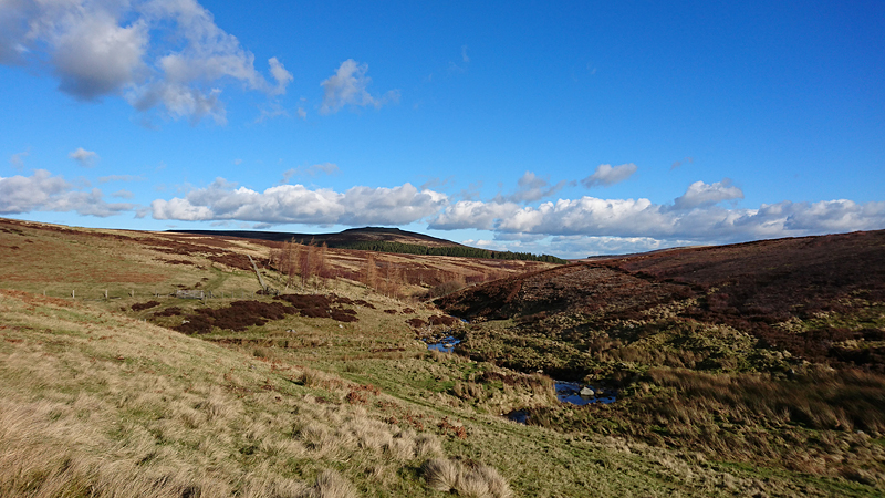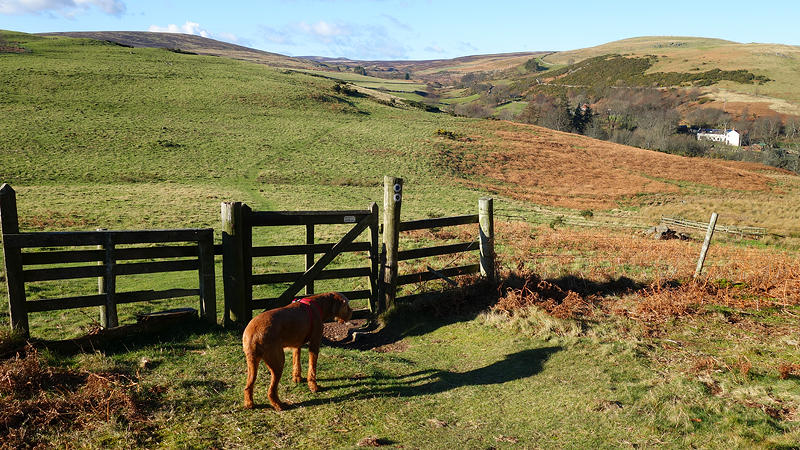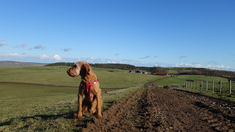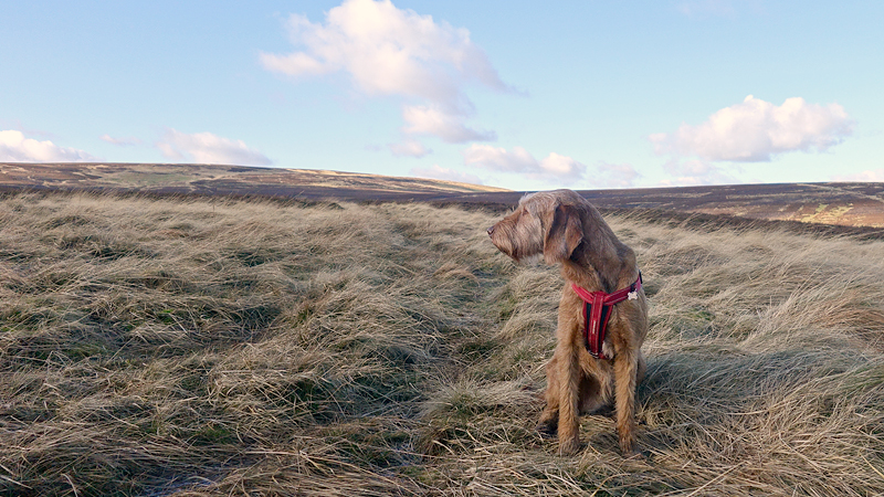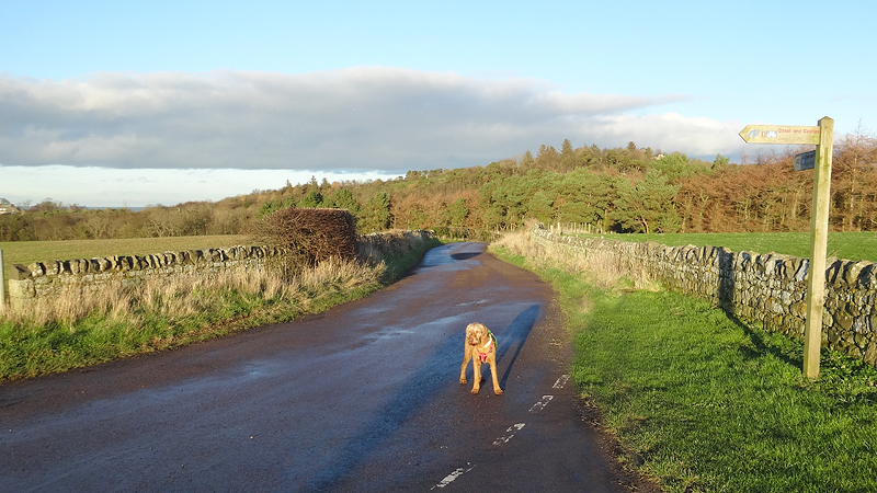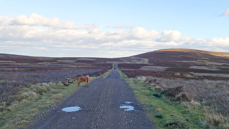 Ik loop in de richting van Spindlestone waar ik vorige week op de lange loop ook langs liep, maar nu loop ik een andere route. Dat is dus wel weer leuk. Je ziet dat ding al van verre liggen! Met het mooie namiddag licht maak ik een foto van woef en van de route.