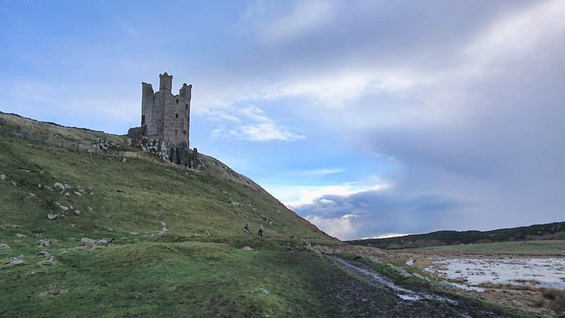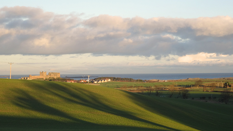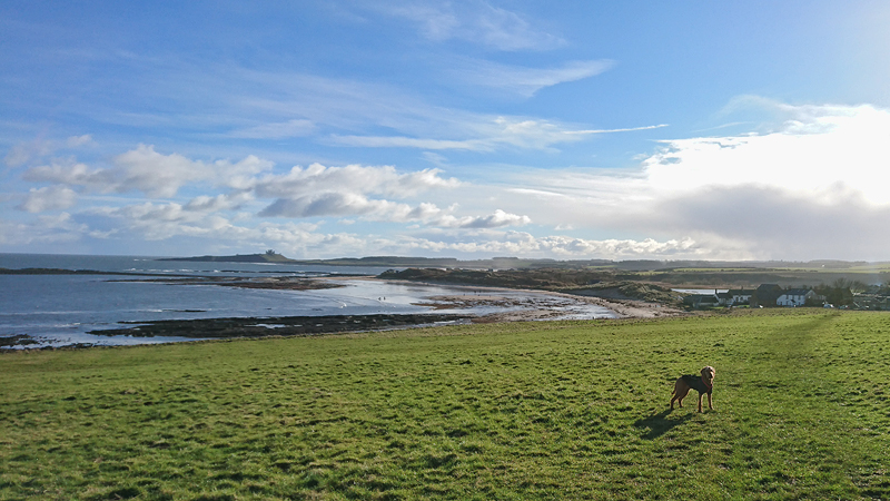 Al snel lopen we over het veld bij Low Newton. Het loopt allemaal heerlijk, ik voel me goed en woef heeft geen interesse meer in reutjes dus dat loopt ook fijn. Ik kijk eens naar links en zie Dunstanburgh castle liggen. Zullen we daar maar eens heenlopen?