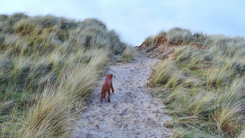 Ik loop net even heuveltje op als ik dat met mezelf aan het overleggen ben. Geen geschikt moment maar ik weet al lang dat ik daarheen ga lopen en zo gebeurt het ook. We hobbelen over het veld verder naar Low Newton en lopen door de duinen richting het strand. Het is nog steeds lente, of eigenlijk zomer.