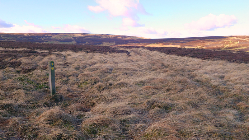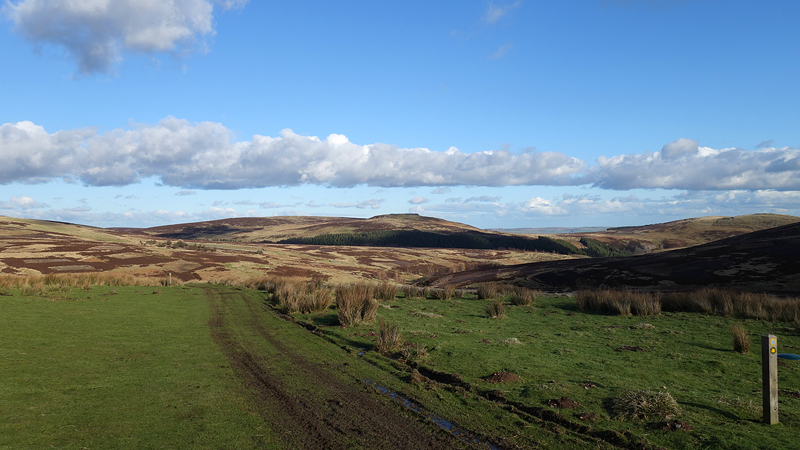 Het is nog maar een klein stukj en dan lopen we de open vlakte al op. Hum… omdat we al vrij hoog zijn, waait het hier behoorlijk en ik ben blij dat ik straks op de terugweg de wind mee zal hebben. Dat schiet dan tenminste op. Ik twijfel nog of ik de St Cuthberts way zal nemen of gewoon de gravel weg op de terugweg maar dat zie ik straks wel. Eerst verder nu over de open vlakte.