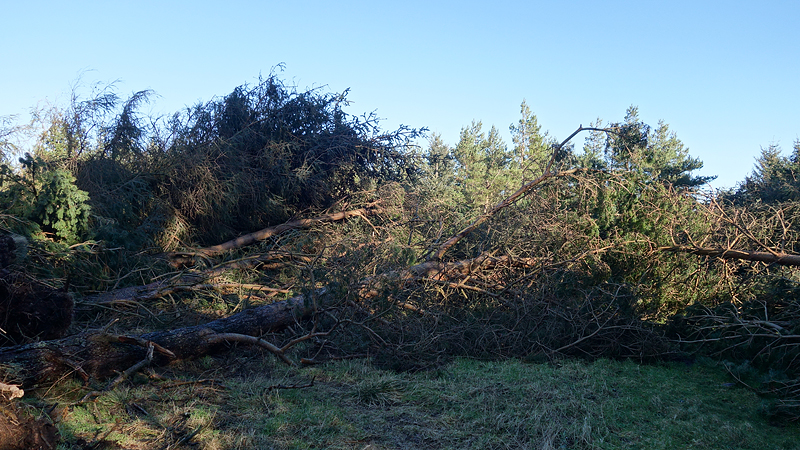 Ik loop door en zie de eerste boom liggen. De storm heeft hier echt huisgehouden dat is duidelijk. Maar als ik verder wil, kan ik eigenlijk nergens langs. Wat een geklooit. Ik klim over stronken en hoop dat de drone niet aan de takken blijft hangen. Woef doet ook haar best. Als ik een pad volg, herken ik het niet en kijkens op de kaart, zie ik dat ik verkeerd ben. Het pad dat ik moet hebben, is afgesloten.