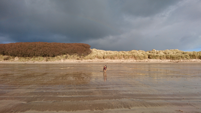 Het lopen gaat super fijn en we schieten lekker op. Dor de duinen richting Long nanny met de vogelhut bij de lange brug. En dan wordt het weer winter. Prachtige donkere luchten ineens met regenbogen. Maar achter me ook de zon (schaduwen!)