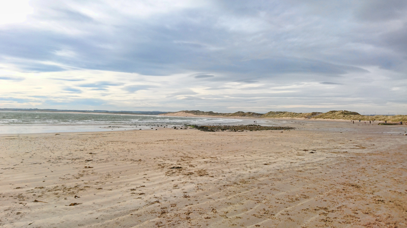 Ik kies weer voor Beadnell gezien het weer en de weg. Bovendien vindt woef het door de duinen ook helemaal leuk dus dat komt wel goed. Ik kies weer voor die nieuwe kousen en weer gebeurt hetzelfde. De eerste 4 kilometer voel ik mijn voeten. Volgende keer trek ik andere sokken aan, want misschien is mijn schoen een beetje ’te vol’ met de sealskinz die ik ook nog aan heb vanwege de modder. Overigens hebben die gekke kousen al heel wat kilometers gezien ook al zijn ze niet waterdicht en laat de boord los aan de bovenkant.