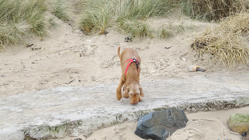 In de duinen kom ik de eerste hond tegen maar het is een vrouwtje. Geen probleem dus. Verderop nog een mannetje en een vrouwtje maar dan heb ik woef al aan de riem.