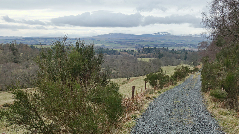 Maar dan ineens ben ik uit het bos en loop ik op een pad met prachtig uitzicht. Wat jammer dat het niet helderder is voor de fotos. Ik kan toch vrij ver kijken. Maar de weg loopt nog altijd naar boven en ik ben benieuwd naar Ros Castle settlement. Volgens mij is dat bovenop dat hompje dat ik voor me zie liggen als ik zo eens op de kaart tuur.