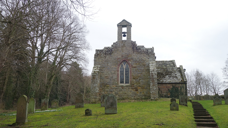 Ik parkeer de auto bij het kerkje in Chillingham. Het kasteel zou nog gesloten zijn en vanaf het kerkje zou ik via grote hoogte ook een blikje kunnen werpen op het kasteel als ik de kaart goed begrijp tenminste. Ik loop naar de achterkant van het kerkje en en maak een plaatje van het kerkje. De drone gaat hoger en hoger vanwege alle bomen en verdomd: daar is ineens het kasteel met de tuinen in beeld.