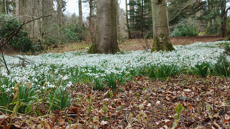 Als ik even de voorkant van het kasteel bekeken heb ga ik gauw verder. Ik neem een lusje door een bos met enorm veel sneeuwklokjes en loop daarna de fraaie poort alweer uit, richting de weg.