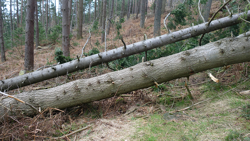 We lopen weer een stukje bos door en de bomen zijn enorm hoog. Mooi gezicht die smalle stammen die de diepte in gaan. Het enige probleem hier vormen de omgevallen bomen. Door de stormen van de afgelopen maand is er hier heel wat gesneuveld en ik moet mijn best doen om overal overheen te klimmen.