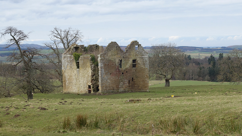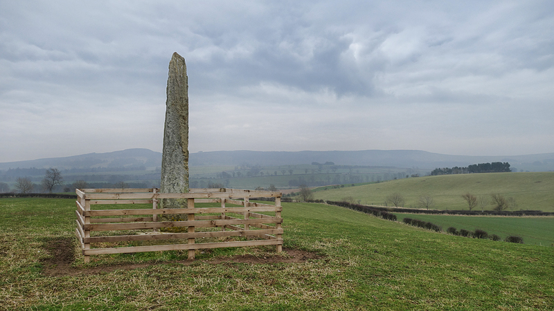 En al snel zie ik waar ik heen moet en kies ik een hek om de akker op te lopen naar de twee bezienswaardigheden. Wederom vreselijk jammer dat het geen helder weer is, want de met sneeuw bedekte cheviots op de achtergrond moeten fantastisch zijn als achtergrond met goed weer. Maar ik vind dit al erg leuk zo onderweg.