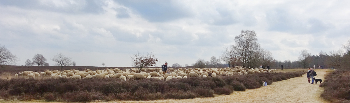 Al snel zijn we bij de afslag naar rechts, en steken we even de weg over richting de heide. We kiezen vandaag voor de korte route die ongeveer 15 km zal zijn. Op de heide moet woef even aan de riem in verband met de schaapskudde en voor het eerst in al die tijd dat we hier lopen, staat de kudde vlak langs het pad. Dat is wel erg leuk, zeker met de lammetjes die overigens al heel groot zijn en blijkbaar in de winter binnen zijn geboren.