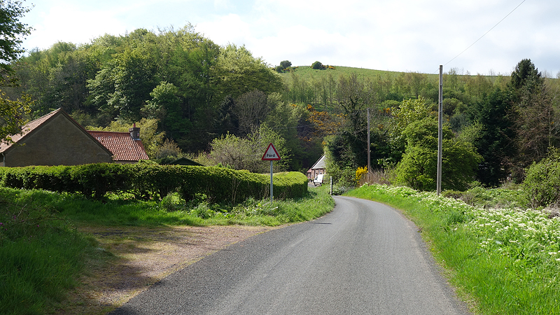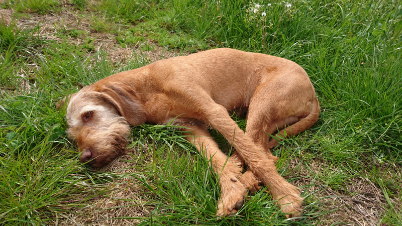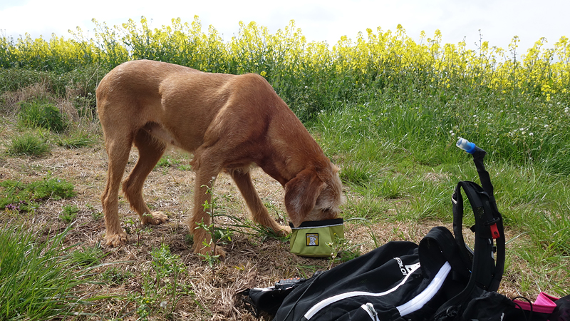 Ik wandel omhoog bij Spott House en geef waf nog wat water. Ik kijk op de klok en besluit dat ik haar beter wat eten kan geven omdat we zeker nog 5 km onderweg zijn. Met dit tempo duurt dat nog even want ik moet nu eerst naar 225 meter klimmen straks (vanaf 60 mtr). Die weg stijgt en stijgt maar door en ik wil best even niksen nu. Dat voederen betekent wel dat ik moet wachten en dat is prima. Ik ga lekker in het zonnetje zitten en kijk om me heen. Wafje heeft in twee happen haar eten op en gaat daarna lekker tegen me aanhangen. Lekker warm dat lijfje. Wat is ze toch lief.