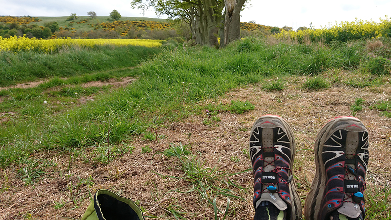 Omdat het zonnetje weer door de wolken piept, besluit ik alsnog op de top van de heuvel (Brunt Hill weet ik inmiddels) weer even in de zon te gaan zitten. Wat zeg ik… liggen! Ik leg mijn hoofd lekker op mijn rugzak en na een tijdje komt woef tegen me aanliggen. Mmmm lekker warm zeg. Ik kijk naar de wolken en dommel wat. Ik hoor helemaal niets. Wat vogels, fazanten en wat patrijsjes. Wat zou er allemaal achter me in het veld gebeuren? Wat heerlijk zo. Ik hoef en moet niks. Zo lang heb ik dus echt nog nooit over een lousy 15 km gedaan en wat is het lekker zo.