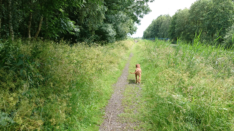 Zo gezegd zo gedaan en al snel zijn we op pad. Dat valt niet mee. Het is erg warm, en zo over de weg is ook niet alles. Maar we zien al dat ik eigenlijk ook parallel aan de verharde weg kan lopen achter het muurtje. Misschien iets voor de terugweg. We besluiten in ieder geval al snel om een andere route te nemen. Niet over de weg maar ergens rechtsaf een pad op dat rechtstreeks naar het castle zou lopen. Eerst daar maar eens heen en dan zien we wel weer verder! Als we bi het paadje komen, blijkt dat een ‘echt’ pad te zijn richting het castle. We zullen dus in ieder geval goed uitkomen daar. Het is alleen een beetje overwoekerd maar wel te doen al rennend en ook met de fiets. Woef vindt het natuurlijk helemaal gaaf.