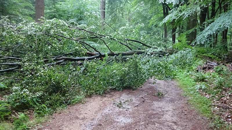 Het regent nu echt keihard en S gaat zijn regenbroek aantrekken. Ik loop door en stuit op een omgevallen boom. Hij ligt dwars over het pad. Zouden we dat gehoord hebben net? Ik kan niet goed zien of de boom er net ligt maar in ieder geval is er nog geen paadje omheen gemaakt door wandelaars die toch verder willen. Het zou dus heel goed kunnen dat dit de klap was die we gehoord hebben.