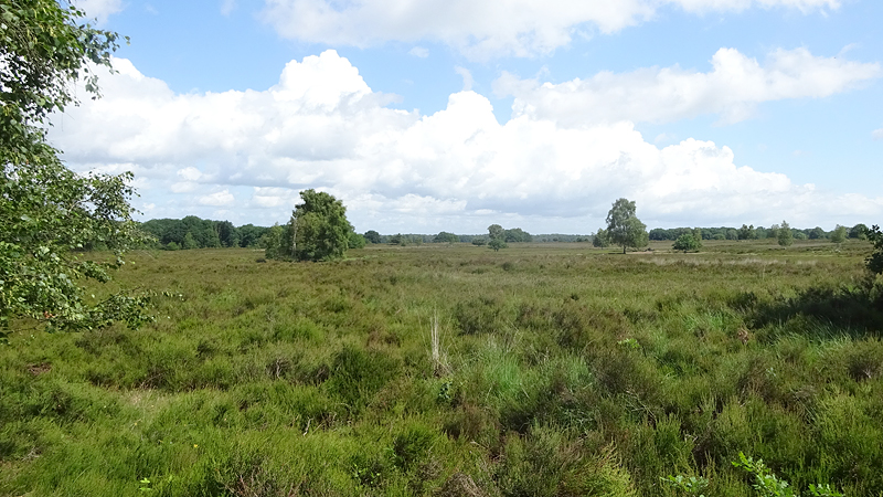 Volgens buienradar zou het net na aankomst in Garderen gaan regenen. Als we aankomen, maken we alles dus snel klaar en ik ga vast van start voor de loopronde. Inderdaad begint het meteen te gieten. Echt keihard en ik ben in een oogwenk behoorlijk nat. Maar hoe minder je aanhebt, hoe minder vervelend het eigenlijk is. Omdat het niet koud is, is het voor woef ook niet zo erg. Ik hobbel dus vrolijk door maar ben blij met mijn mafate speed schoenen omdat je daar prima grip mee hebt op natte grond. Dit is alweer mijn derde paar maar ik heb in Nederland er nog niet eerder mee gelopen omdat beide andere paren altijd alweer retour winkel waren voordat ik terug keerde naar Nederland na mijn Schotland runs waar steevast de hele upper uit elkaar scheurde. Na een tijdje komt S. me ook weer achterop fietsen. Dat duurde best nog even voordat hij weer bij me is maar nu kunnen we weer samen door. Wafje loopt ook dapper mee door de regen. Grappig genoeg zijn het echt buien, want na de keiharde regen, klaart het ook weer even op en soms komt zelfs de zon tevoorschijn. We lopen eerst door het bos en slaan na een kilometer of 5 weer rechtsaf richting de schaapskooi in Ermelo. Daar lopen we even een stukje over de heide met rul zand.