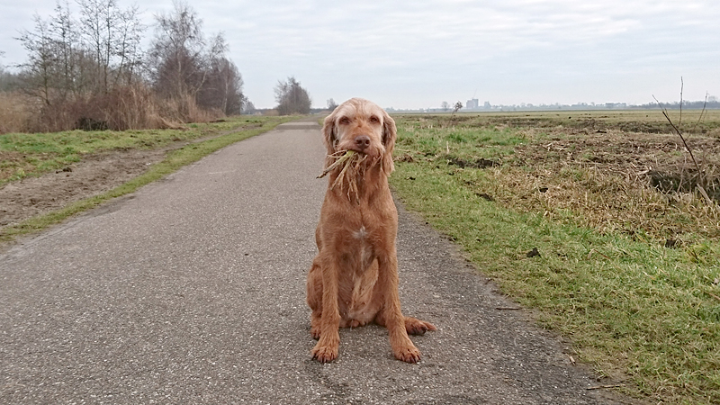 Bij het punt waar we in de zomer wafje even water geven, maken we een selfie waarbij de camera zo pardoes voorover valt in de sneeuw. Alles is daarna nat en zo verlies ik weer tijd met het droogmaken van alles. Zucht. Daarna lopen we verder richting de weg, steken over en gaan naar de heide.