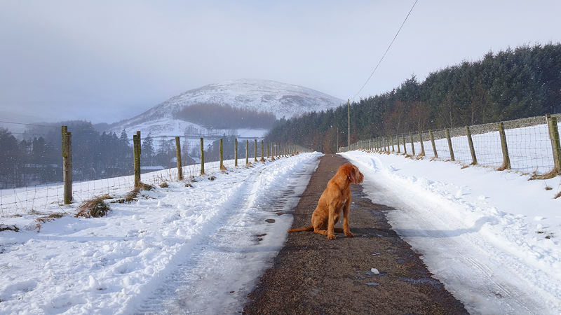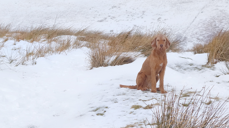 Na de watervallen moest ik eerst een stukje terug en ik besloot toch door te gaan met het lusje en niet zomaar terug naar de auto te gaan. Het weer was niet echt slecht en ik was totaal niet koud, dus vooruit maar! Ook dat stuk ging best aardig maar was erg zwaar door de klim. Maar ik kende de weg en ik wist dat na de klim een heel stuk weg naar beneden zou gaan en als ik me niet vergiste zouden we zelfs wind mee hebben. Dat was maar goed ook, want ineens sneeuwde het toch best behoorlijk en in de wind was dat niet zo lekker. Waf ging er heel zielig bij zitten toen ik een foto maakte van de omgeving!